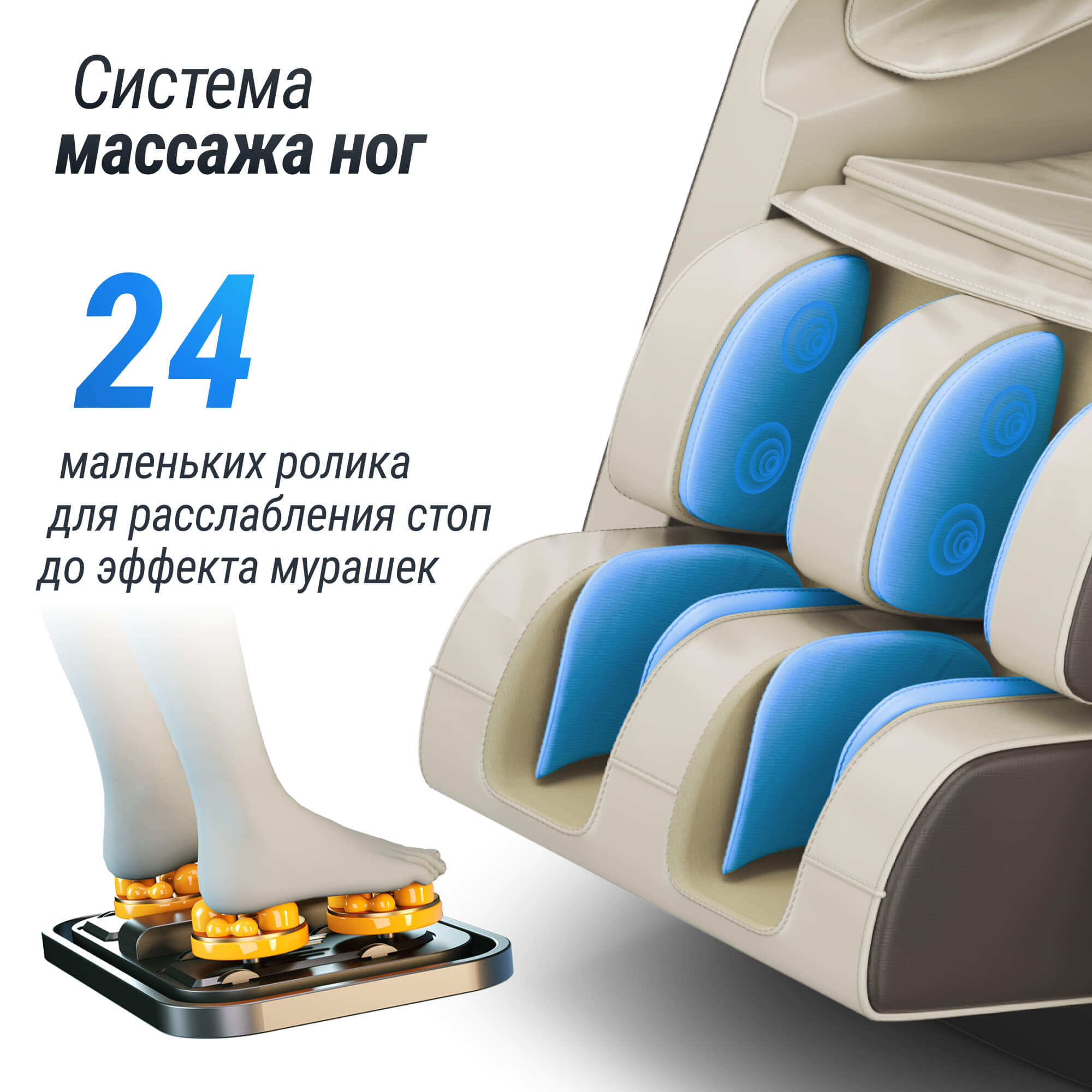 - Программы и режимы на выбор. Каждый человек уникален, и кресло это понимает! Вы можете выбрать один из нескольких автоматических режимов массажа – режим разминания, Шиацу, силовой режим, программа Расслабление мышц и режим Перед сном. Также вы можете выбрать программу автоматического аэромассажа или самостоятельно выбрать зону плеч и головы, рук или ног, а также настроить интенсивность воздействия. А функция подогрева спины подарит дополнительный комфорт во время сеанса. Теперь вы можете наслаждаться массажем, который подходит именно вам! Кресло для массажа включает в себя валики для стоп и ягодиц. Так же предусмотрены: ручной режим, режим нулевая гравитация, режим запуска валика для ног или валика для ягодиц.
