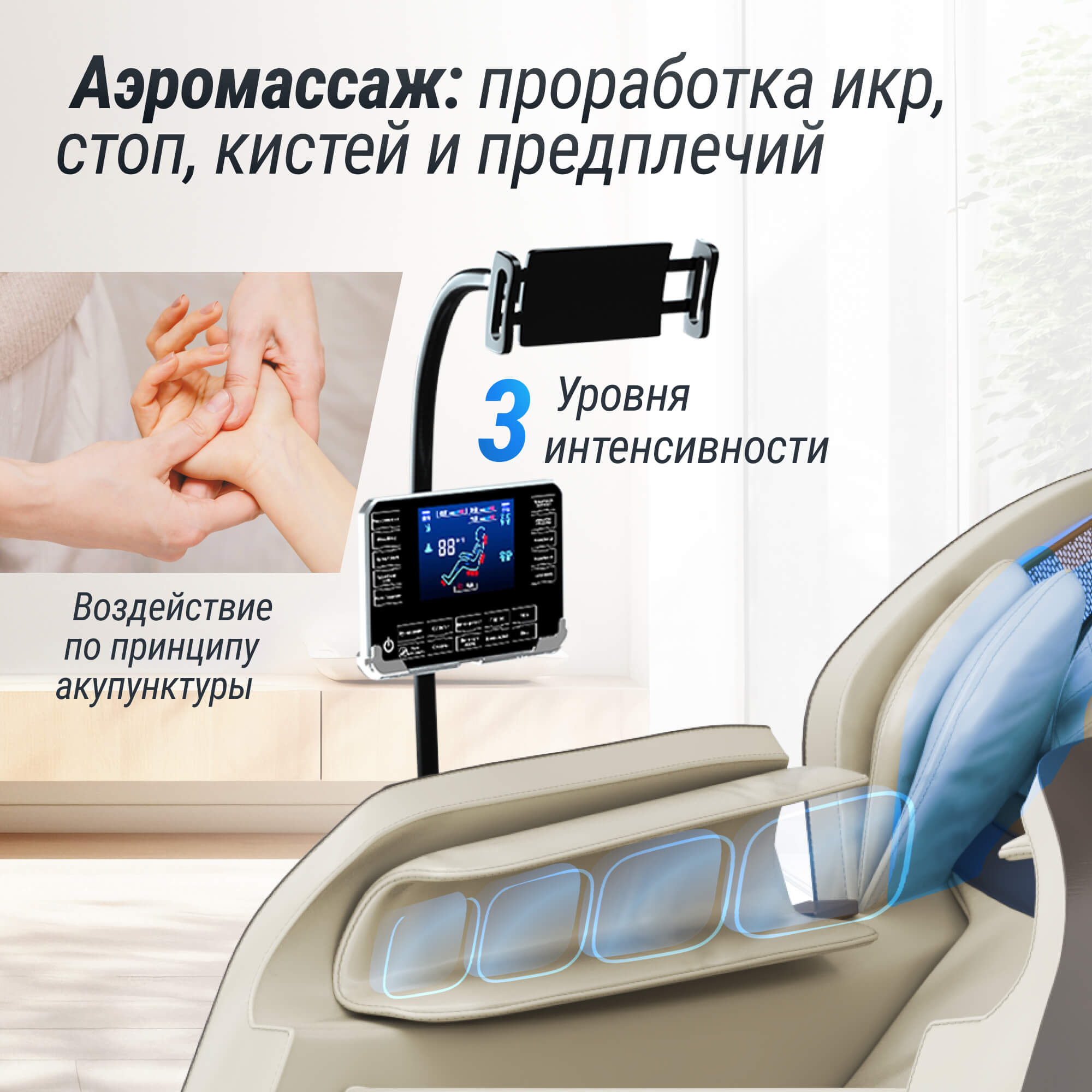 - Управляйте с легкостью! Интуитивно понятный сенсорный пульт управления в виде планшета располагается на подлокотнике. Кресло оборудовано гибким держателем для смартфона, он надежно фиксирует телефон, обеспечивая максимальный комфорт. Массажное кресло оснащено поворотным переключателем для управления программами массажа. При необходимости в меню можно настроить подогрев, скорость, время. Широкий диапазон изменения уровня давления и времени поможет настроить массажный механизм под свои потребности.