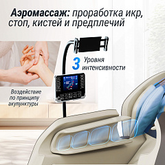 - Аэромассаж. Воздушно-компрессионный массаж со встроенными воздушными подушками расположенными по всему креслу оказывают воздействие на все тело человека. Воздушные подушки обеспечивают возможность выполнения легкого расслабляющего массажа, в результате нормализуется кровообращение и артериальное давление, убирается отечность, такой массаж благотворно влияет на лимфатическую систему, сердечно-сосудистую систему, на мышечные ткани. Чередование воздушной компрессии и обычного массажа благотворно сказывается на всех процессах в организме человека. Воздушно-компрессионный массаж рекомендован для коррекции фигуры, восстановления упругости кожи и ее эластичности.