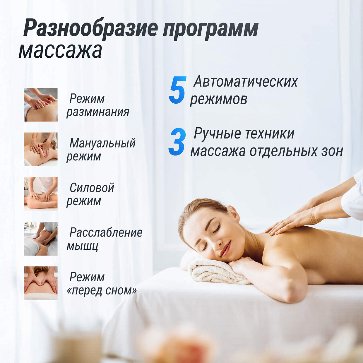 режим разминания, Шиацу, силовой режим, расслабление мышц, режим "Перед сном", автоматический массаж, аэромассаж плеч/головы, рук, ног, ручной режим, нулевая гравитация