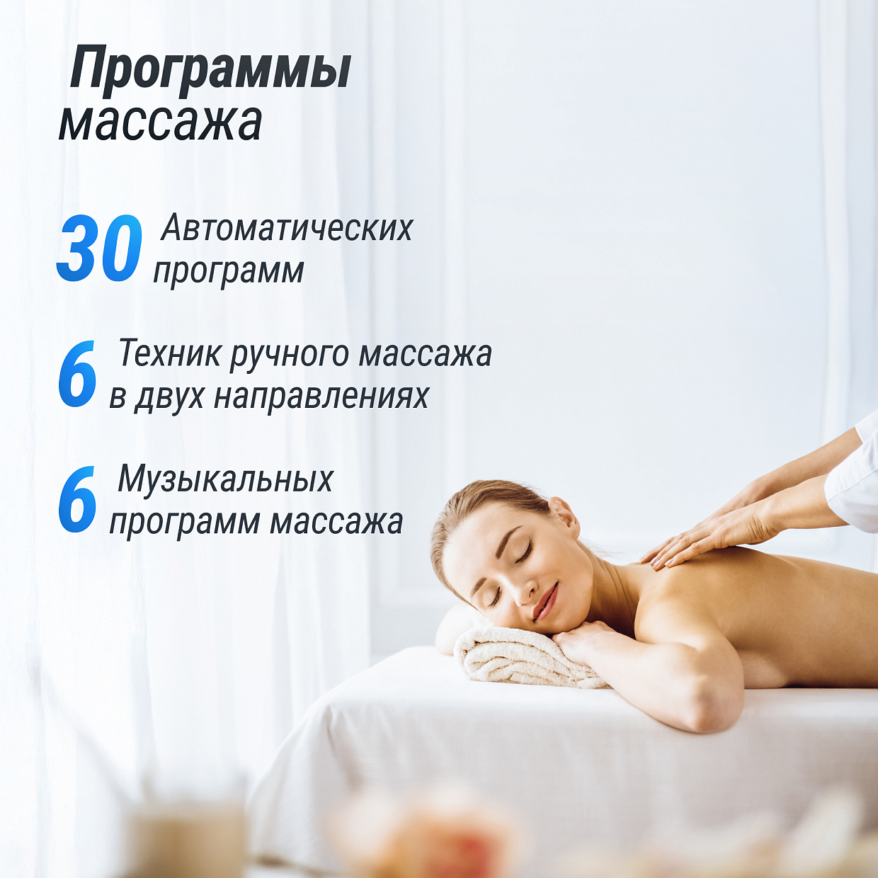 | Мультимедиа | 6 музыкальных режимов: успокаивающая и спокойная музыка, сопровождая сеанс музыкального массажа, снимает стресс, улучшает настроение, способствует физическому и психическому здоровью, аудиосистема состоит из левого и правого встроенных стереодинамиков, а также функции Bluetooth для подключения смарт устройств и воспроизведения любимой музыки |