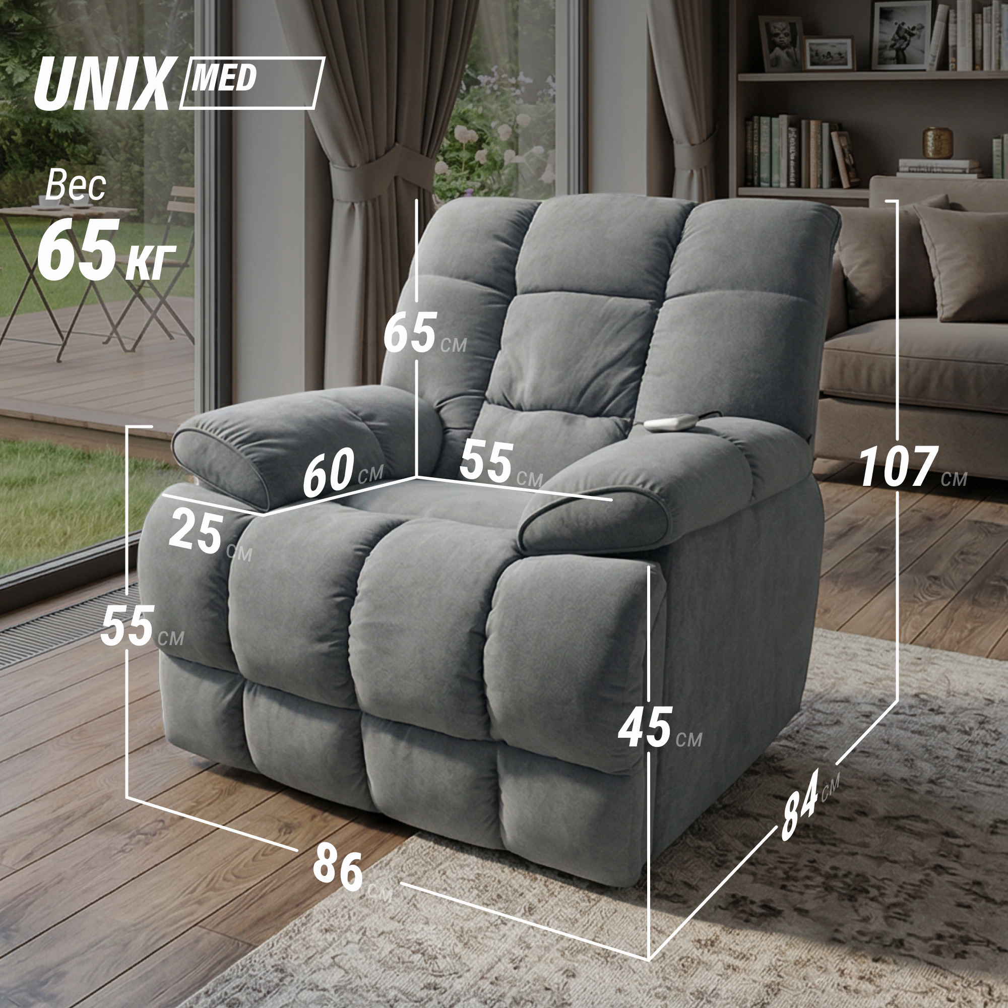 Обладая уникальными характеристиками и гармонично сочетая последние технологии массажа с безупречным видом интерьерного кресла, реклайнер UNIX Med подойдет для тех, кто ценит свое здоровье и комфорт. Это не просто удобное кресло — это ваш личный домашний спа-салон премиум-класса, созданный специально для максимального расслабления мышц, снятия стресса и восстановления жизненных сил.