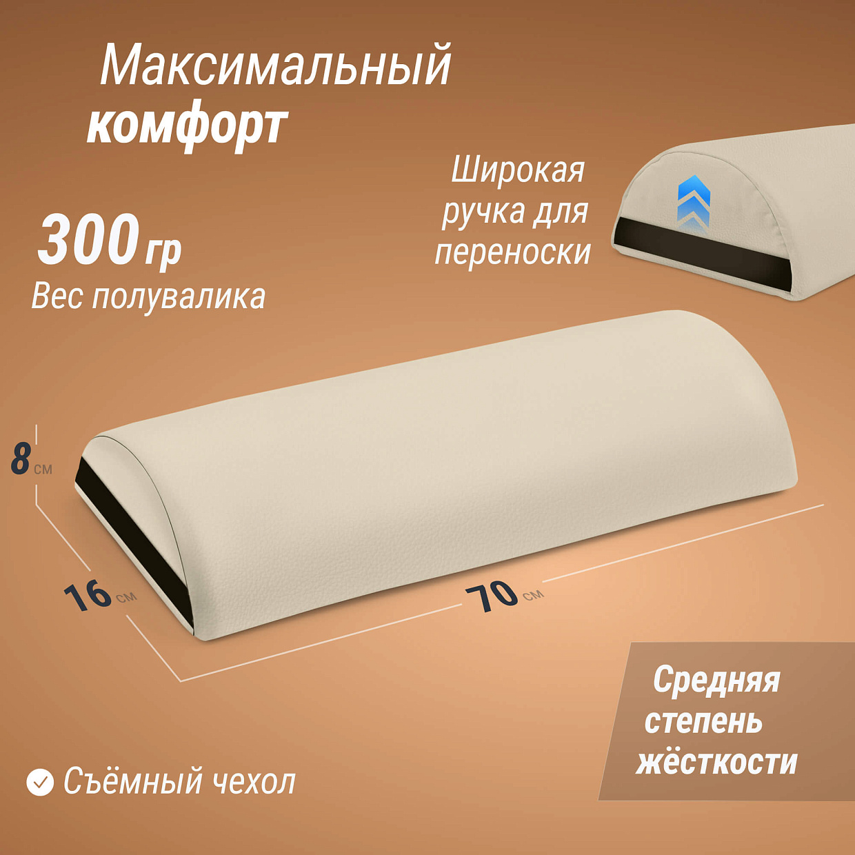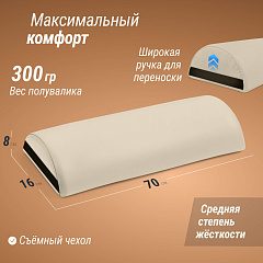Одним из ключевых преимуществ данного полувалика является наличие съемного чехла. Это решение значительно упрощает уход за изделием: чехол можно легко снять и почистить, что помогает поддерживать высокий уровень гигиены. Такая функция особенно важна в условиях массажного кабинета, салона красоты, где чистота и безопасность клиентов стоят на первом месте. Для облегчения переноски валик оснащен широкой удобной ручкой, интегрированной непосредственно в его конструкцию. Эта деталь делает транспортировку простой и комфортной, позволяя перемещать данный аксессуар без особых усилий. Вес изделия составляет всего 300 грамм.
