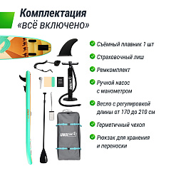 | Комплектация | Доска и весло, 1 съемный плавник, непромокаемый чехол для телефона и документов, страховочный лиш, ключ для замены клапана, заплатка на случай пореза, насос с монометром, эластичный шнур на доске для хранения вещей, рюкзак для хранения |