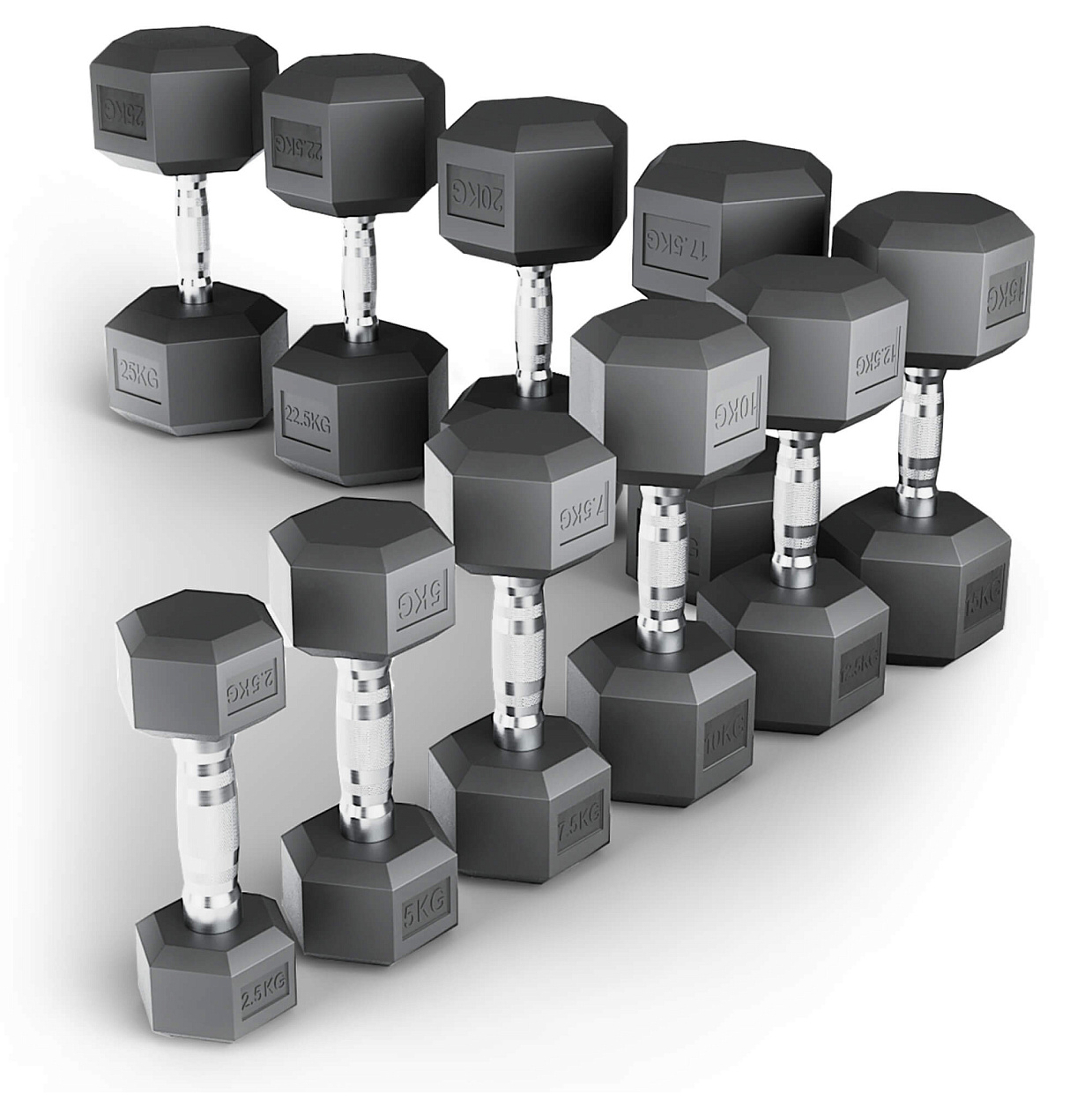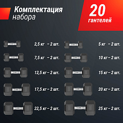 Набор обрезиненных гантелей включает в себя веса 2,5 кг, 5 кг, 7,5 кг, 10 кг, 12,5 кг, 15 кг, 17,5 кг, 20 кг, 22,5 кг, 25 кг, что позволит вам выбирать оптимальную нагрузку для каждого упражнения. Не упустите возможность вывести свои тренировки на новый уровень!