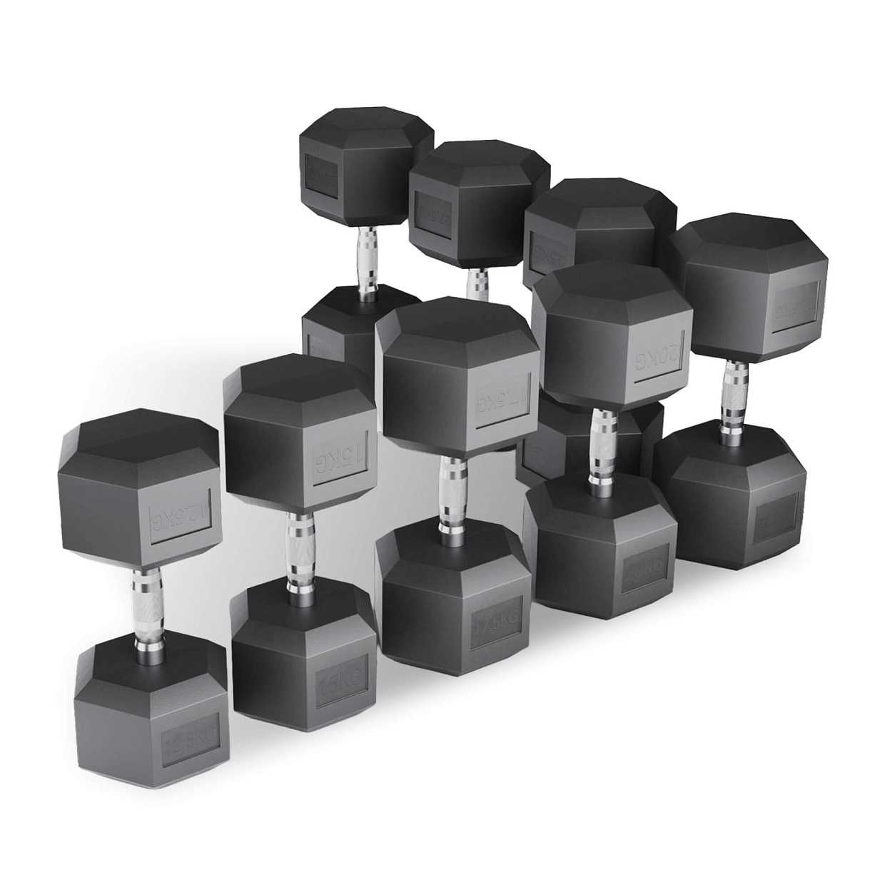 Набор обрезиненных гантелей включает в себя веса 12,5 кг, 15 кг, 17,5 кг, 20 кг, 22,5 кг, 25 кг, 27,5 кг, 30 кг, что позволит вам выбирать оптимальную нагрузку для каждого упражнения. Не упустите возможность вывести свои тренировки на новый уровень!