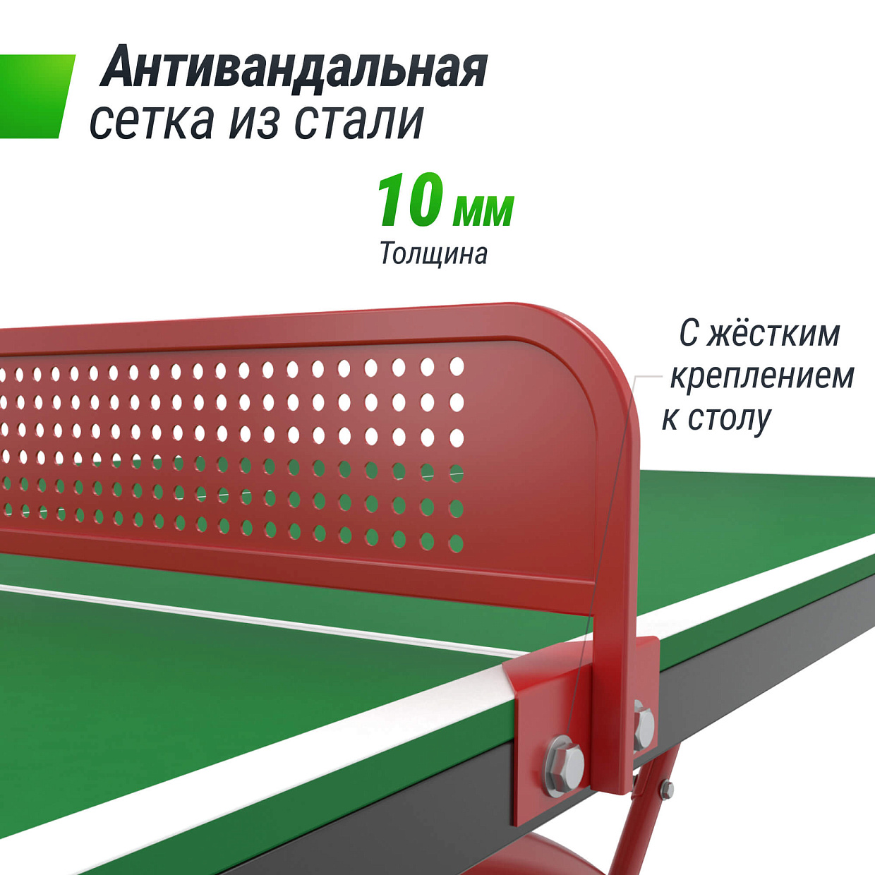 Антивандальная сетка с жестким креплением к столу изготовлена из стали толщиной 1 мм, толщина рамки составляет 10 мм. Благодаря этому, стол для пинг понга отлично подходит для эксплуатации как в частных домах и на дачах, так и в общественных местах, таких как парки, школы и кемпинги.