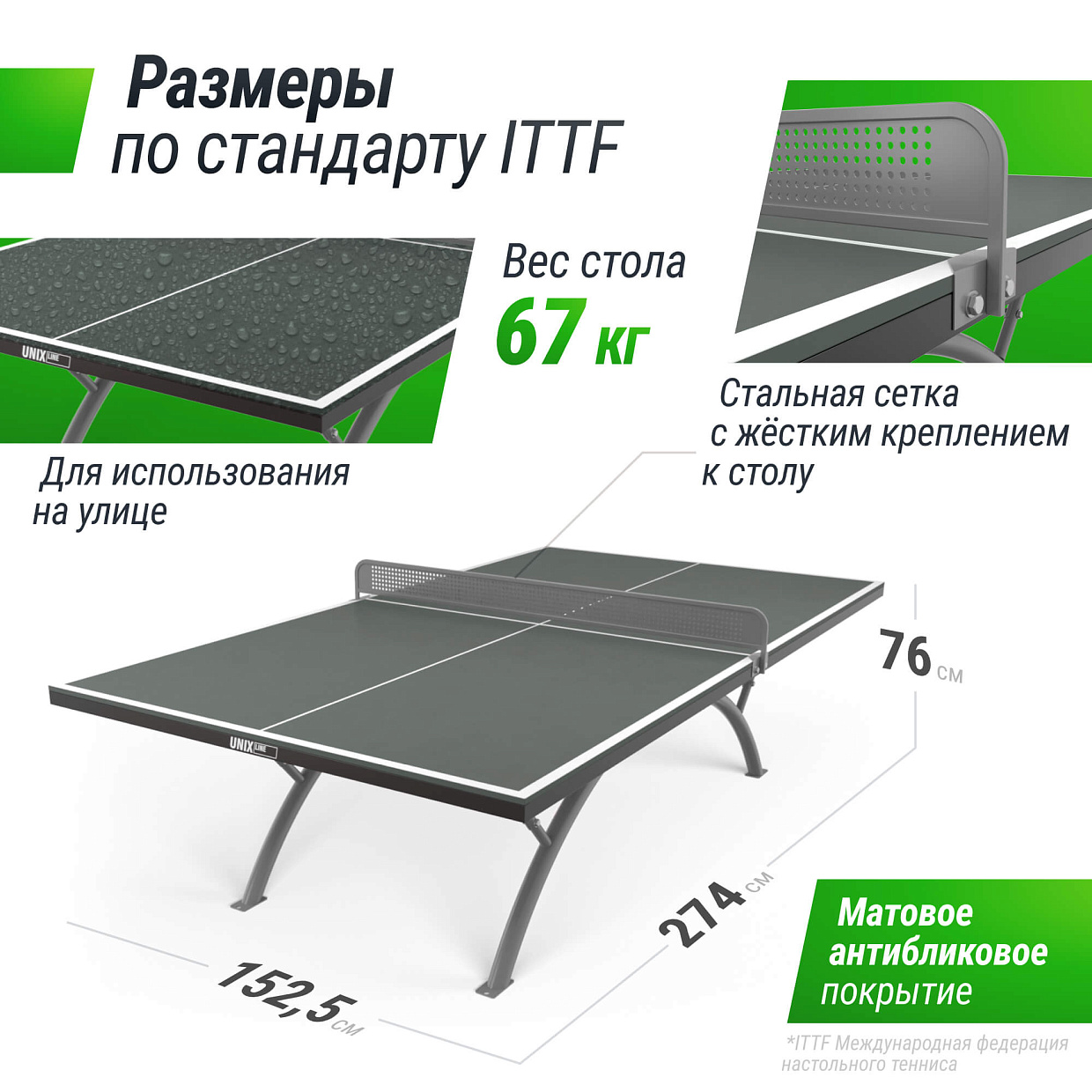 Антивандальный всепогодный стол для настольного тенниса UNIX Line 14 мм разработан специально для использования в парках, во дворах жилых домов, на даче, загородном участке, спортивной площадке на улице. Стол от UNIX Line - отличное решение для всех любителей настольного тенниса! Независимо от погоды или времени года, вы сможете наслаждаться спортивной игрой в теннис с друзьями и семьей!