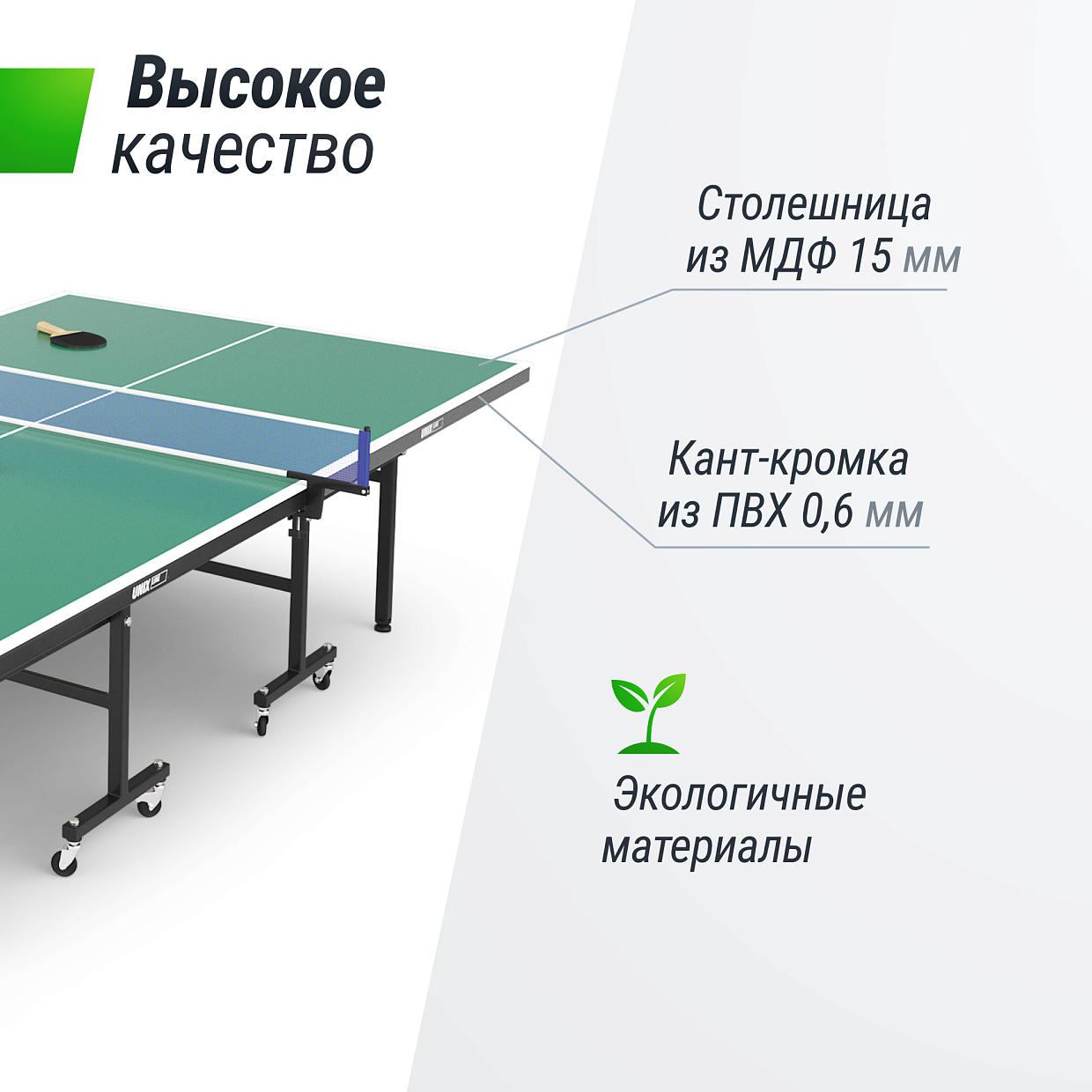 Стол для пинг-понга изготовлен из высококачественного МДФ с устойчивым к повреждениям покрытием, что обеспечивает долговечность и стойкость к износу. Стол выдерживает интенсивные нагрузки и сохраняет свои характеристики даже после множества игр.