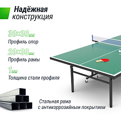 Сетка из нейлона с надежными фиксаторами, а также набор для игры в настольный теннис: 2 ракетки, 3 шарика поставляются в комплекте со столом.