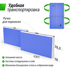 Одной из ключевых особенностей компактного теннисного стола является его система складывания. Инновационный механизм позволяет легко трансформировать стол в удобный кейс с размерами 137 x 76.3 x 10 см. Ручки для переноски обеспечивают простоту перемещения стола, а надежный механизм блокировки фиксирует его в сложенном состоянии, гарантируя безопасность и удобство при транспортировке.
