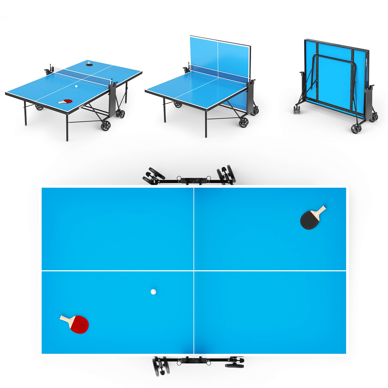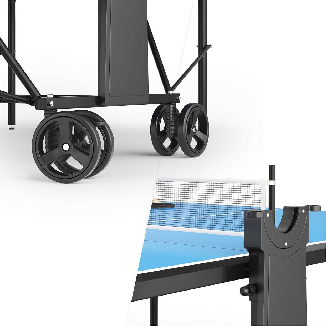 Стол построен на стальном каркасе 30x30 мм с толщиной 1,2 мм с антикоррозионным покрытием, что обеспечивает его жесткость и устойчивость на различных поверхностях. Опоры теннисного стола оборудованы компенсаторами неровности пола. Отличительной особенностью компактного стола для дома и улицы является возможность поднять одну сторону столешницы, позволяя играть в одиночку, что идеально подходит для оттачивания тренировки техники удара и улучшения навыков без необходимости искать партнера. Стол занимает меньше места, когда используется в режиме одиночной игры, делая его отличным выбором для небольших помещений. Предусмотрены отделения для хранения до 4-х мячей с каждой стороны.