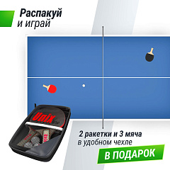 Сетка из нейлона с надежными фиксаторами, а также набор для игры в настольный теннис: 2 ракетки, 3 шарика в сумке, поставляются в комплекте со столом.