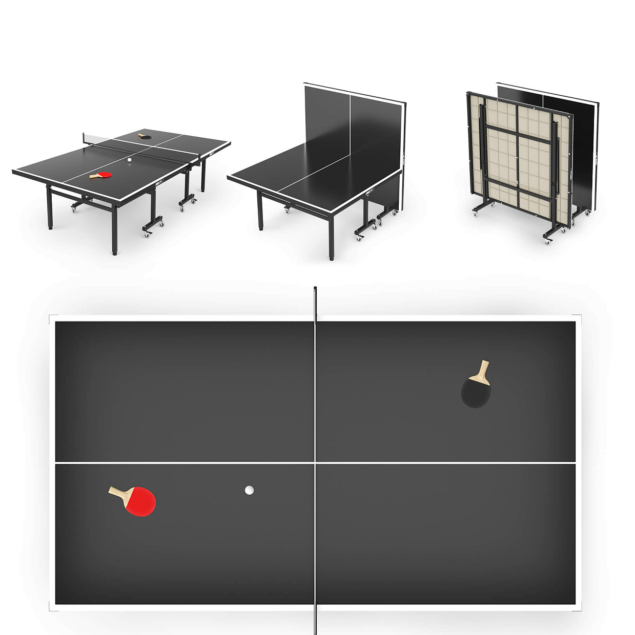 Сетка из нейлона с надежными фиксаторами, а также набор для игры в настольный теннис: 2 ракетки, 3 шарика в сумке, поставляются в комплекте со столом.