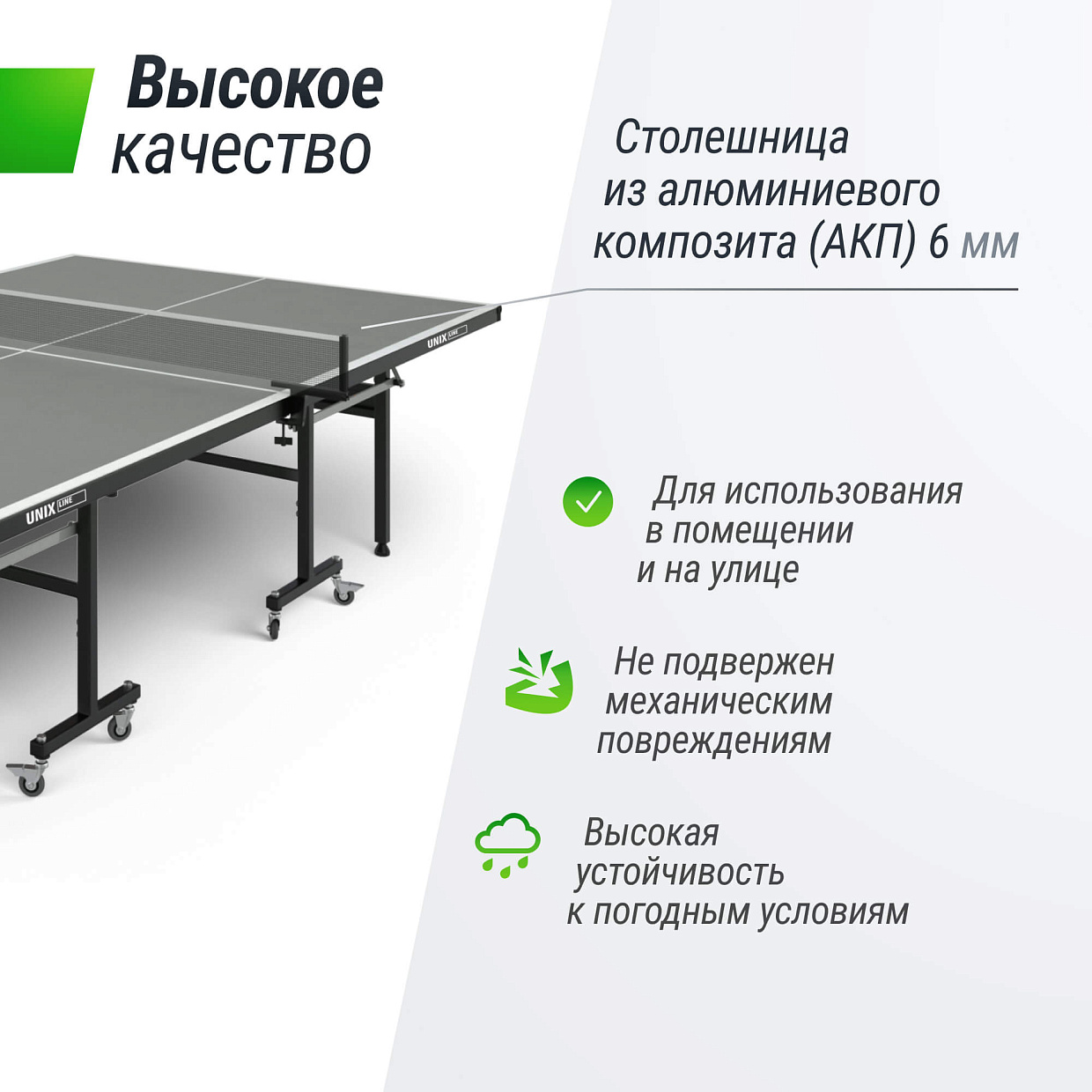 Столешница всепогодных столов UNIX Line изготовлена из композитной алюминиевой плиты с антибликовым покрытием, которая выдерживает самые экстремальные температурные нагрузки, не является горючим материалом, устойчива к осадкам, а также, за счет высокой плотности и толщины столешницы (6 мм), обеспечивается великолепный отскок мяча во время игры.