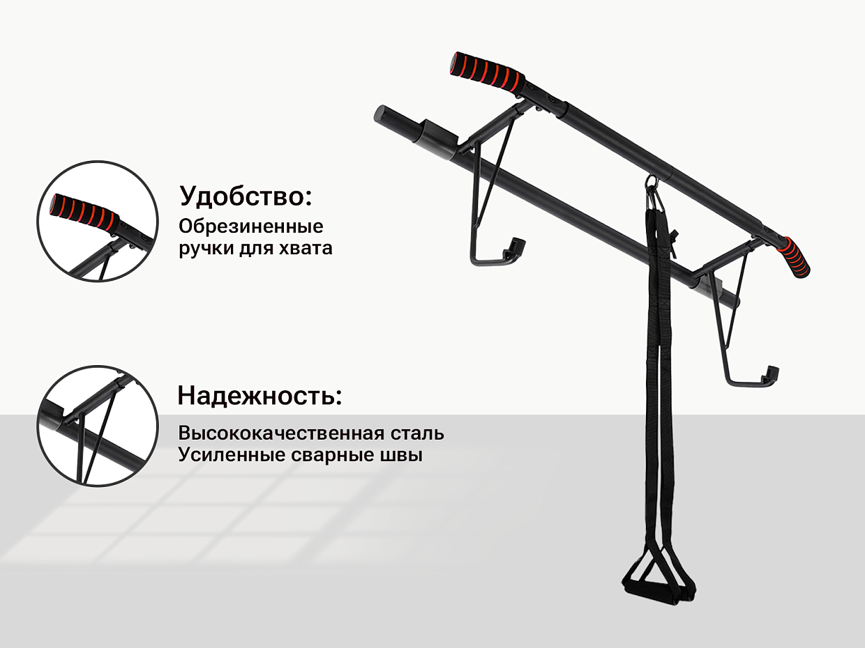 В комплекте к данной модели идут нейлоновые петли для функционального тренинга, которые можно зацепить за турник и усложнить выполнение упражнений с весом собственного тела. С помощью многофункционального турника можно выполнить такие упражнения как подтягивания разным хватом и упражнения на пресс. Эти упражнения идеально подходят для развития и укрепления группы следующих мышц: