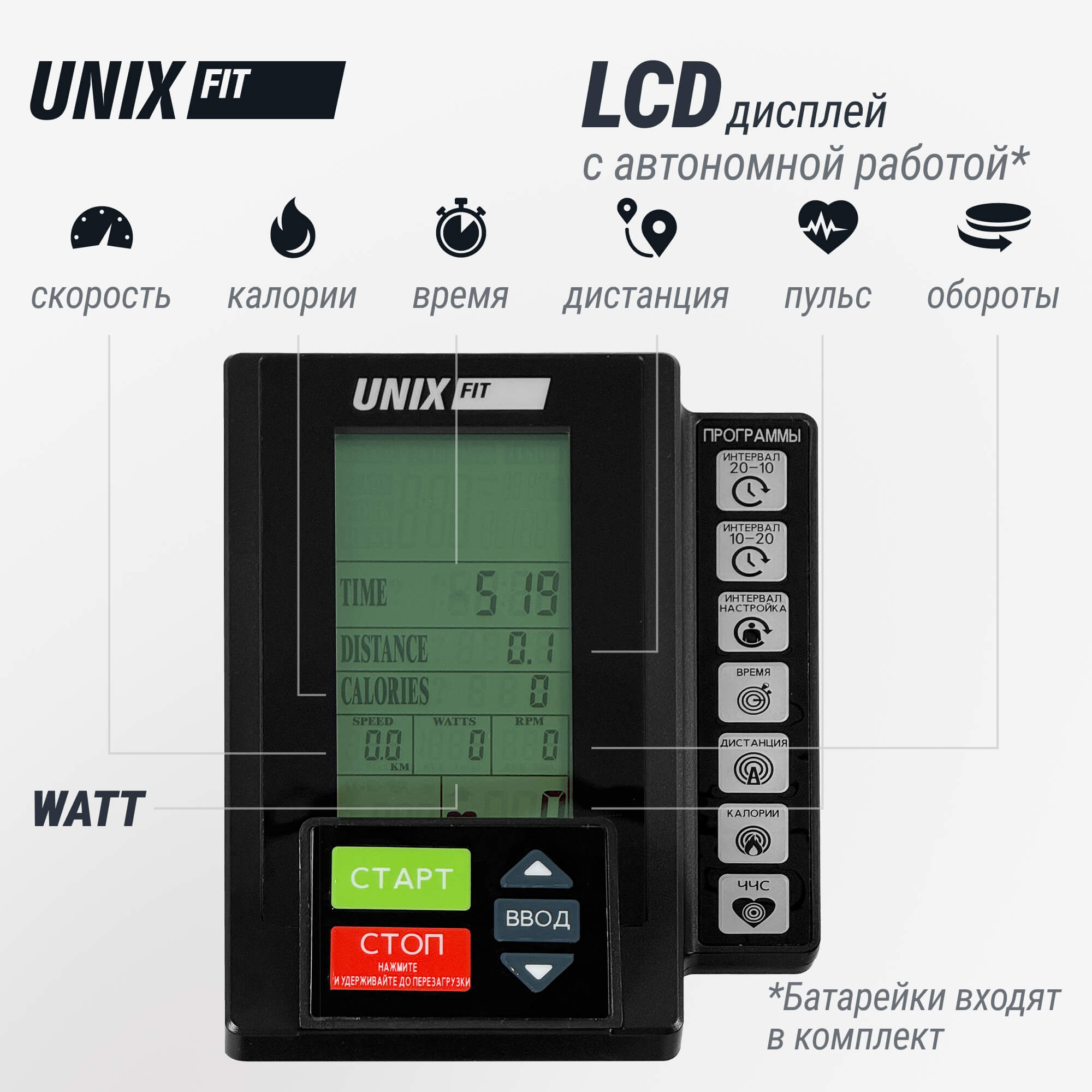 кол-во об/мин, скорость, время, расстояние, калории, Вт, пульс, режим интервальной тренировки, заданный пульс
