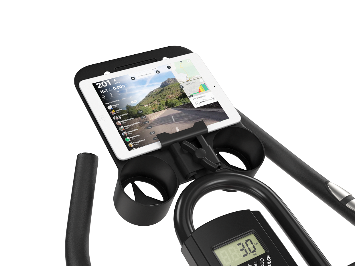 Спин-байк оснащен консолью с LCD-дисплеем, который отображает показатели времени, дистанции, пульса, калорий и скорости. Таким образом, пользователям будет легко получить максимум эффективности от тренировки. В комплекте специальная подставка под планшет или смартфон и пару держателей под бутылочку с водой.