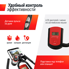 Тренажёр велосипед оснащен многофункциональным LCD-дисплеем, который отображает информацию об основных показателях тренировки. Это поможет отслеживать свой прогресс и мотивировать себя на дальнейшие достижения. Руль оснащен датчиками пульса. А со специальной подставкой для телефона или планшета вы сможете наслаждаться любимым сериалом во время домашней кардио тренировки или не пропустить важный звонок.