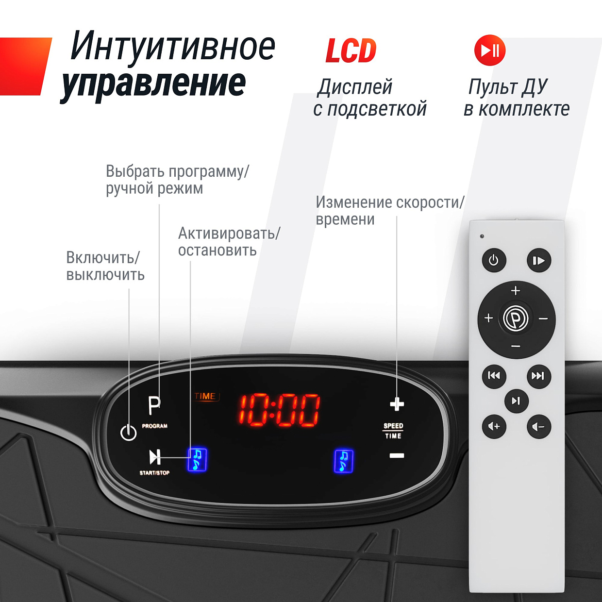 | Особенности | прорезиненные ножки, встроенные колонки в виброплатформу, пульт ДУ позволяет регулировать громкость при подключении телефона при воспроизведении музыки по Bluetooth или USB |
